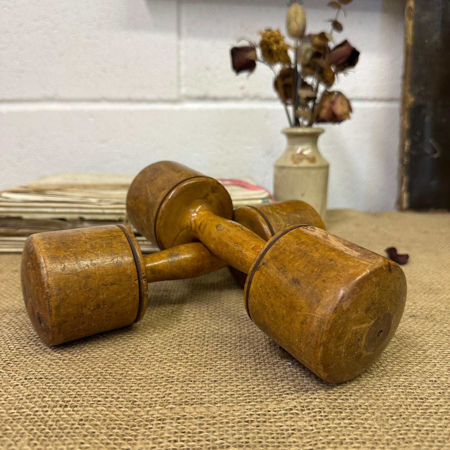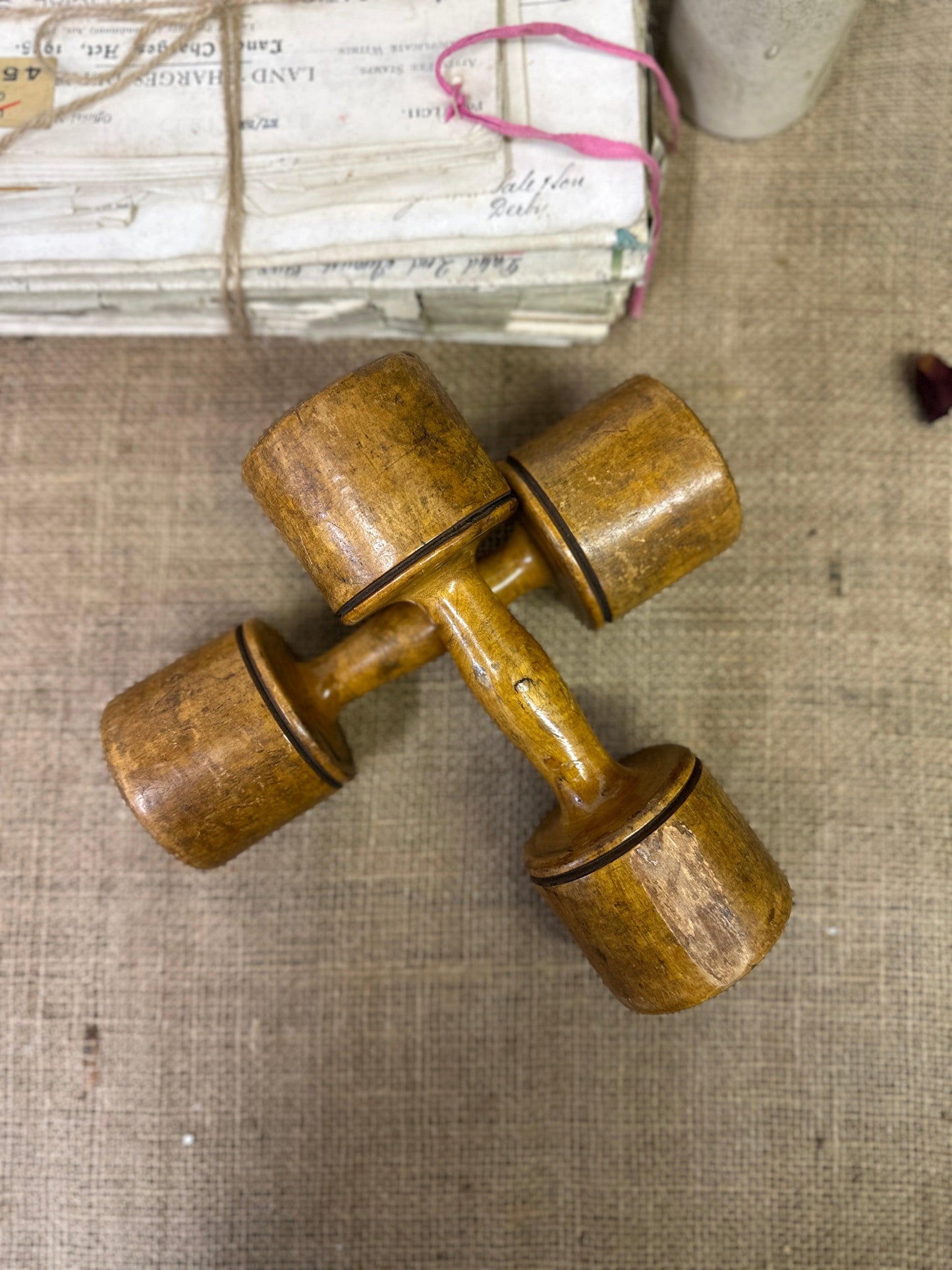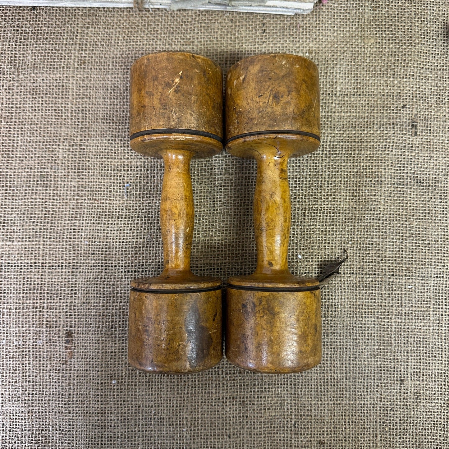 Really tactile wooden pair of dumbbells with great patina. These are a must for a man cave or for sitting on a shelf