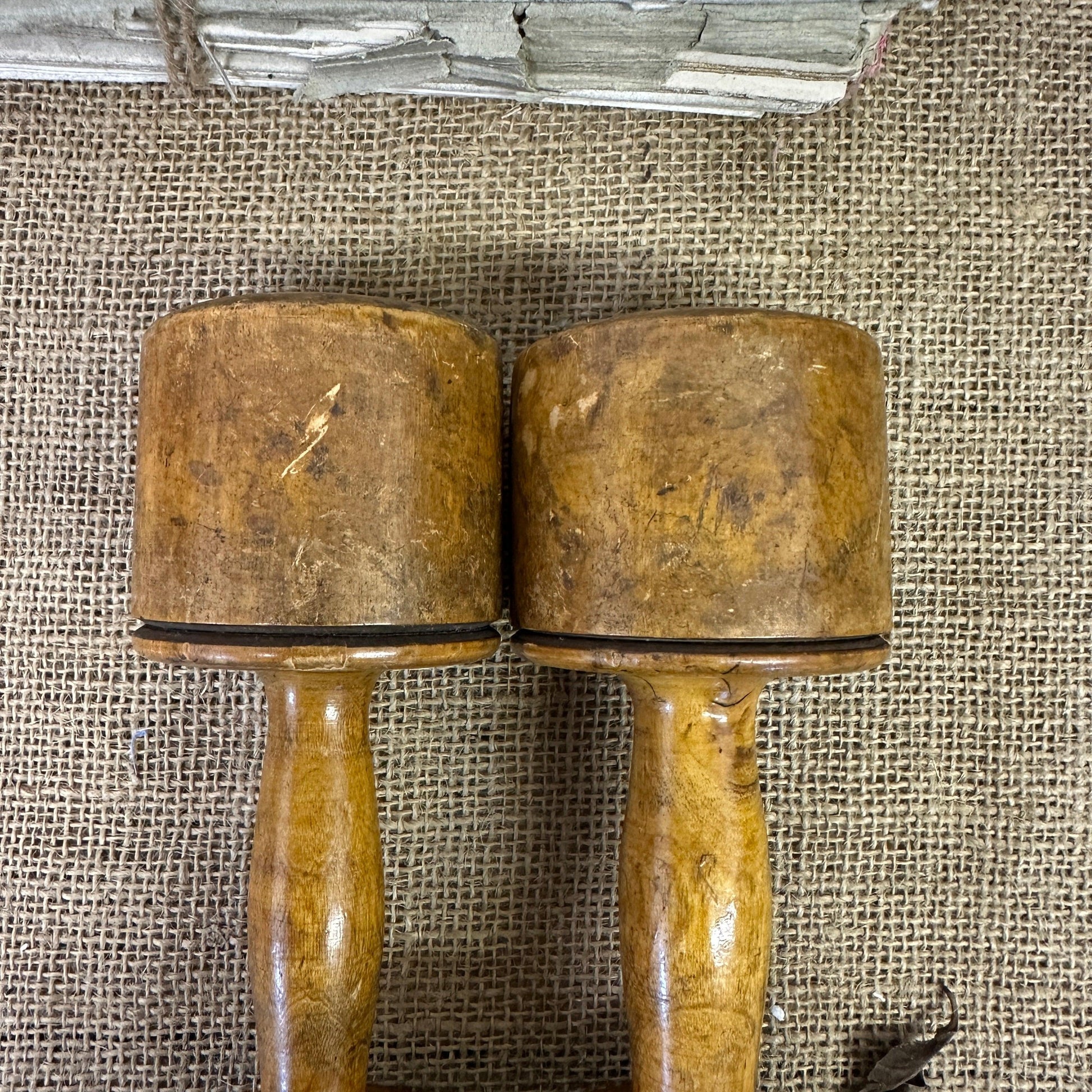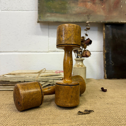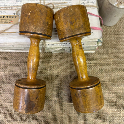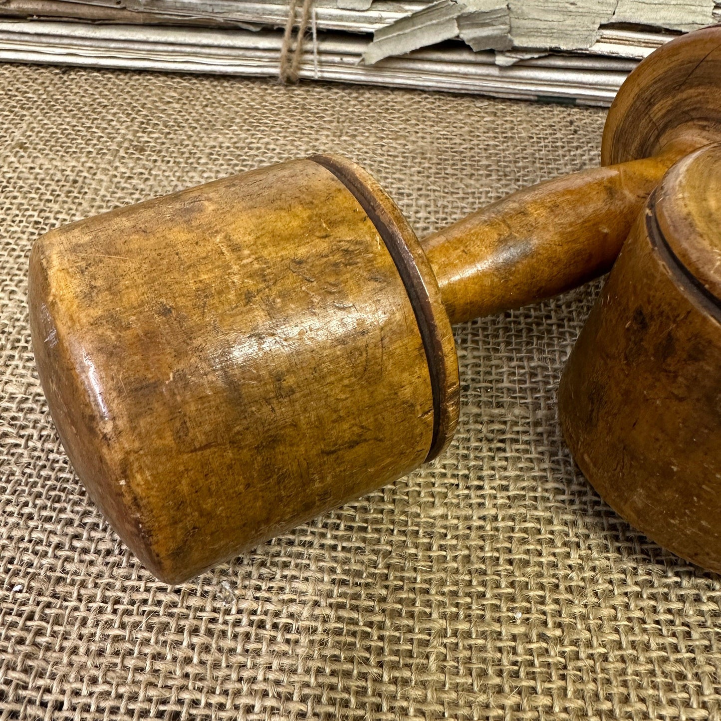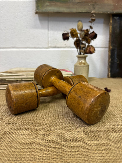 Really tactile wooden pair of dumbbells with great patina. These are a must for a man cave or for sitting on a shelf