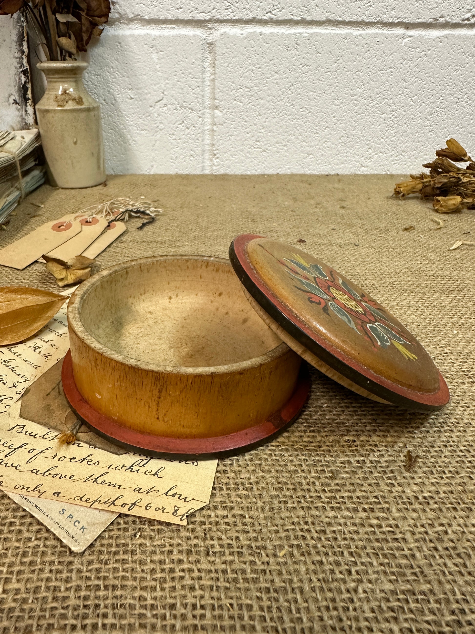 European Folk Art Trinket Lidded Pot. Wooden little dish with a hand painted design on the lid, great for the bedside, or on a shelf to save precious little pieces.