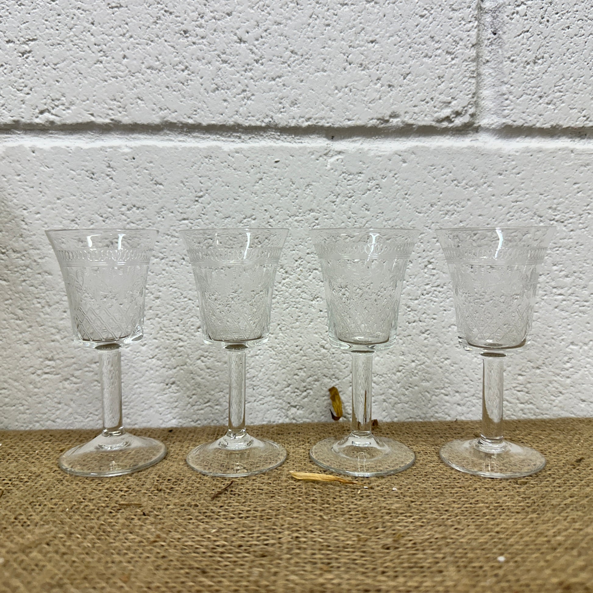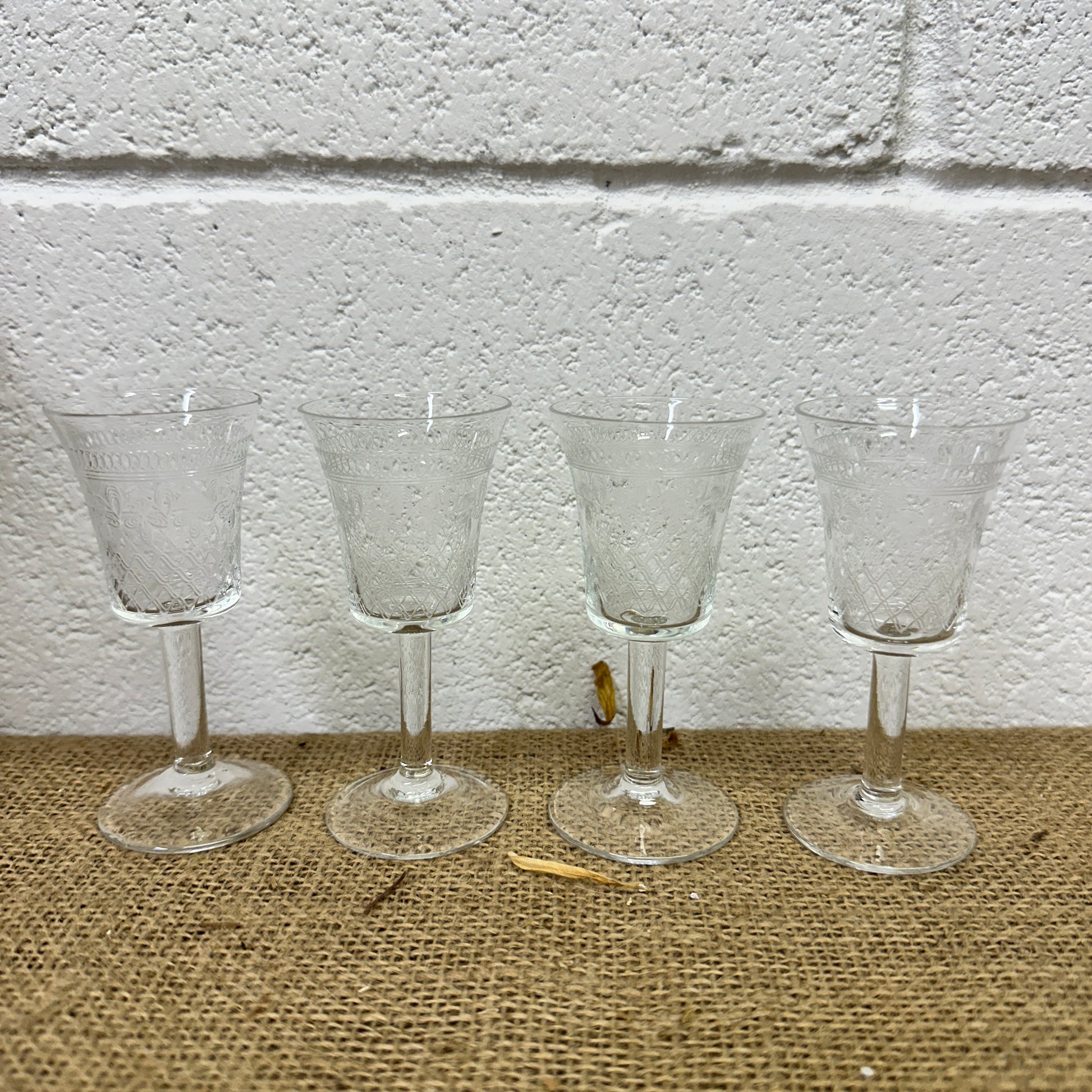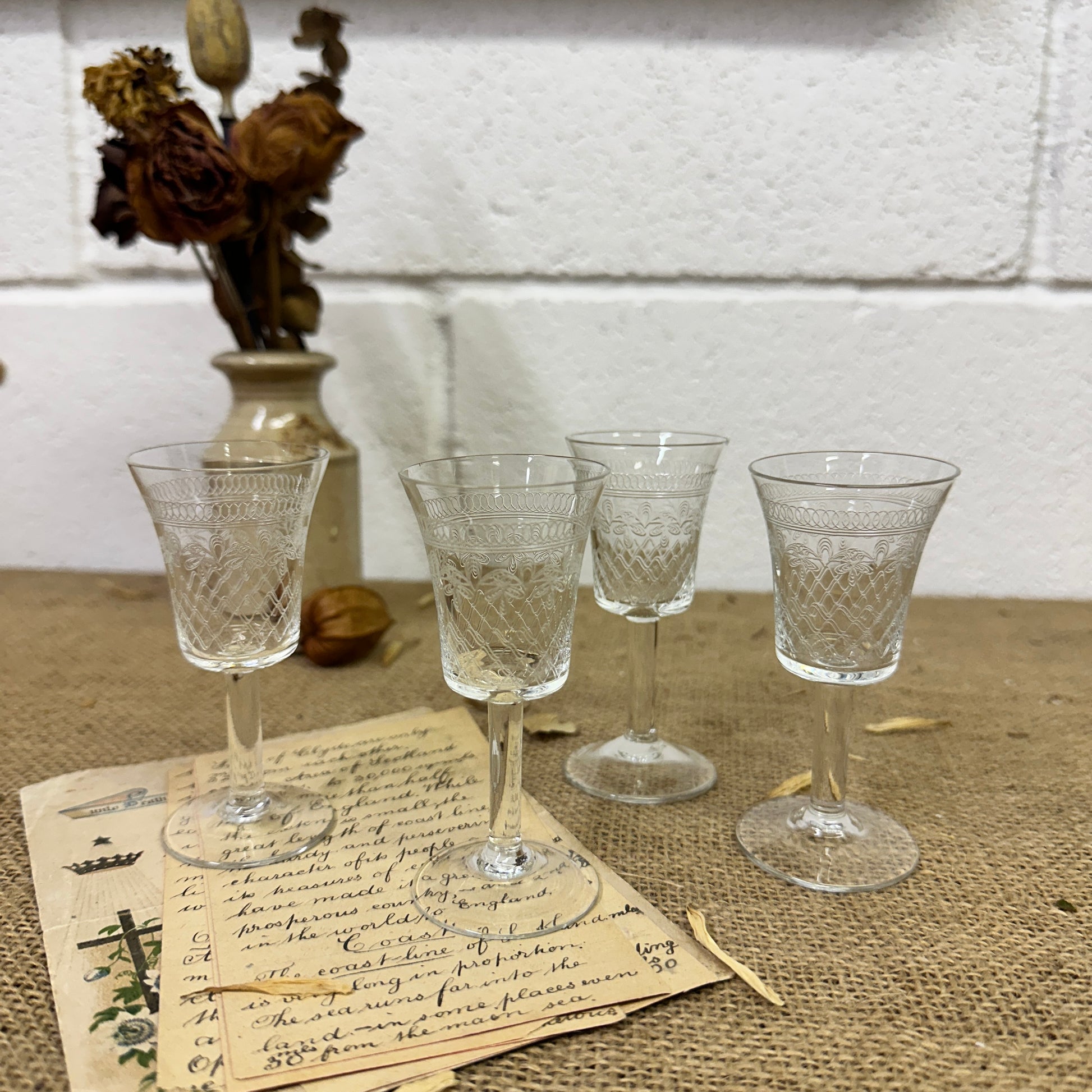 Set of four stunning etched antique sherry glasses . A perfect addition to your home bar. A fabulous gift idea for a friend or loved one
