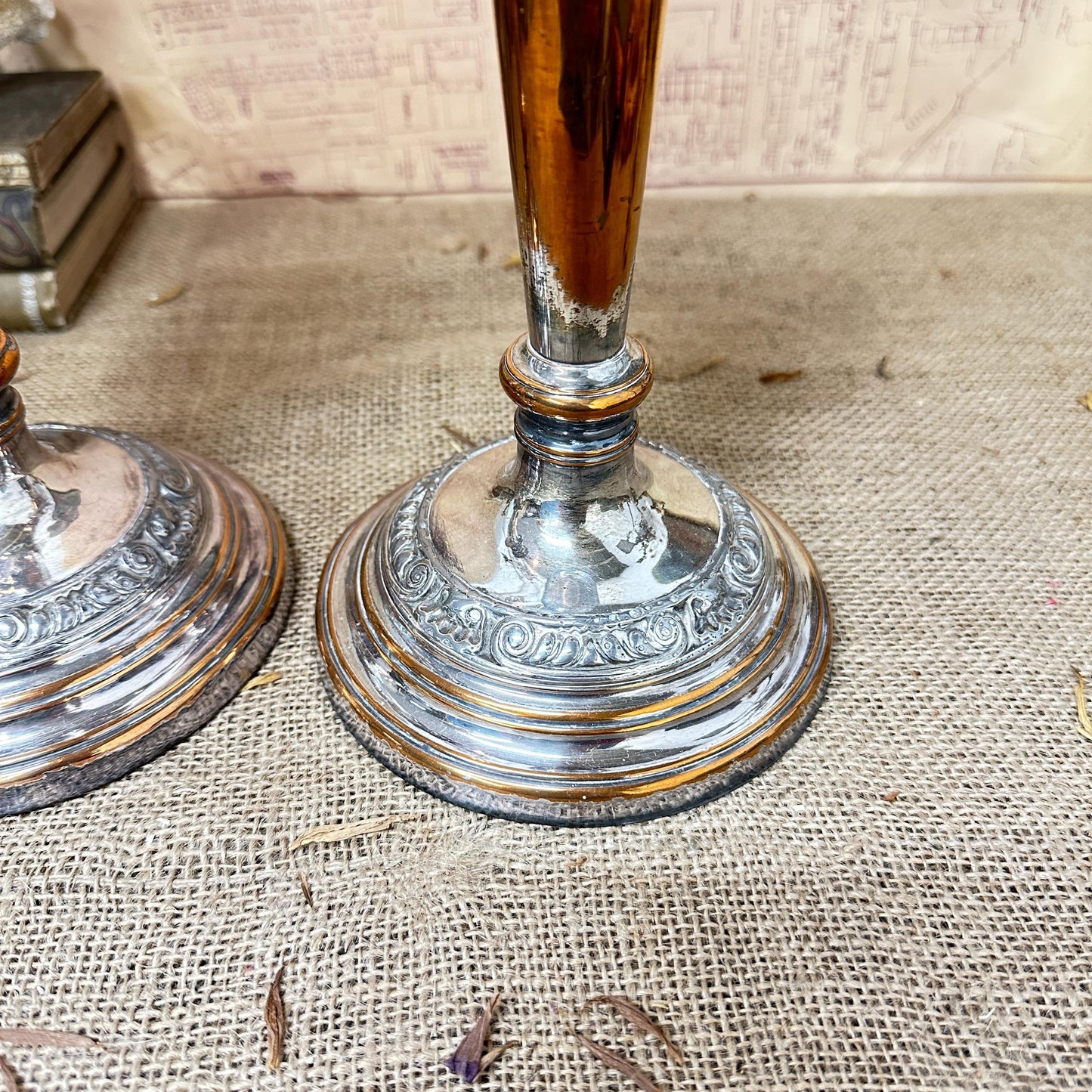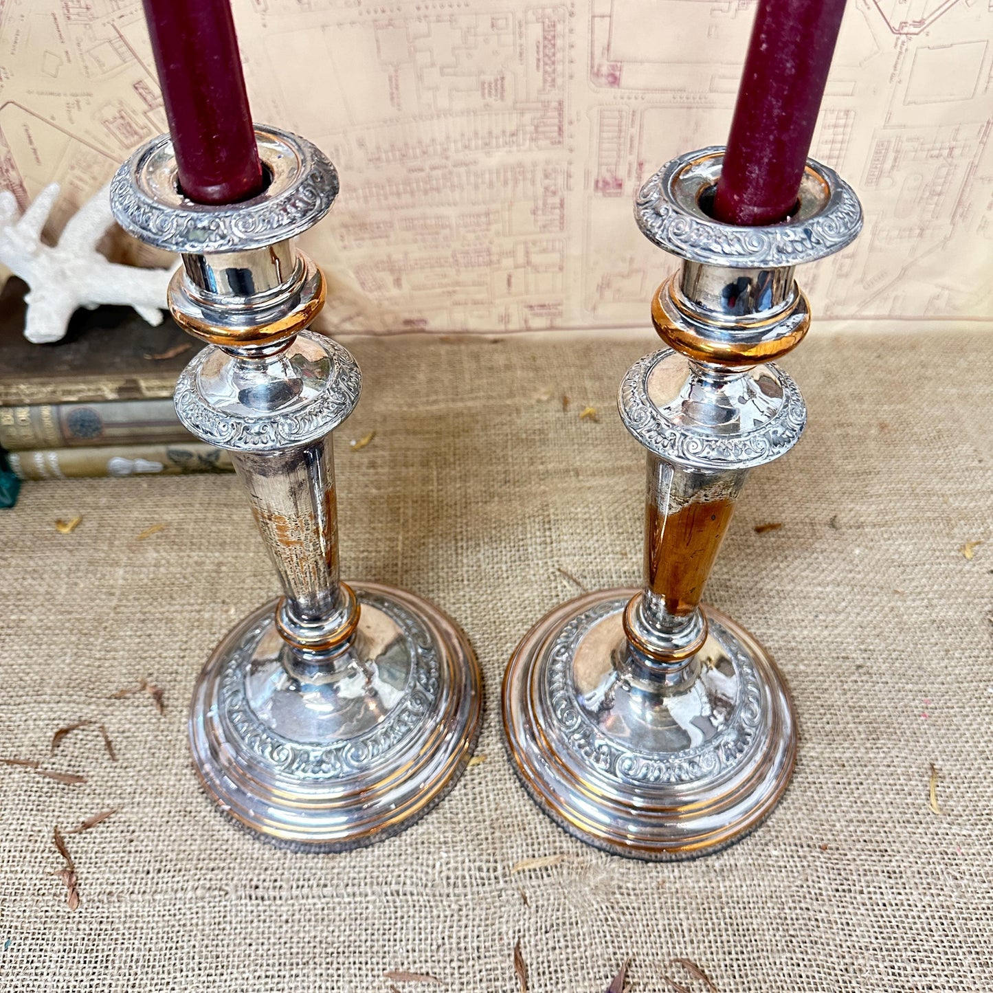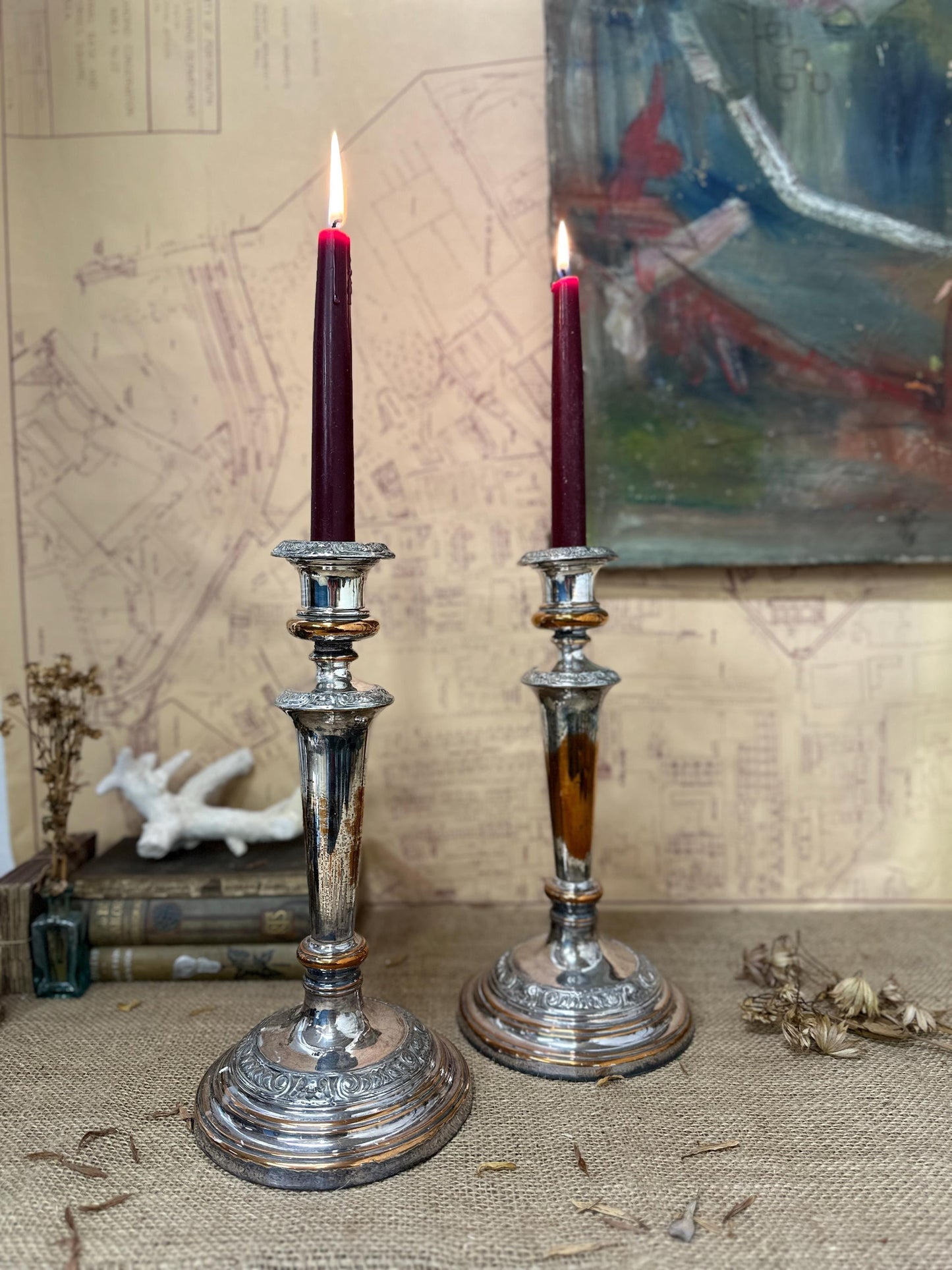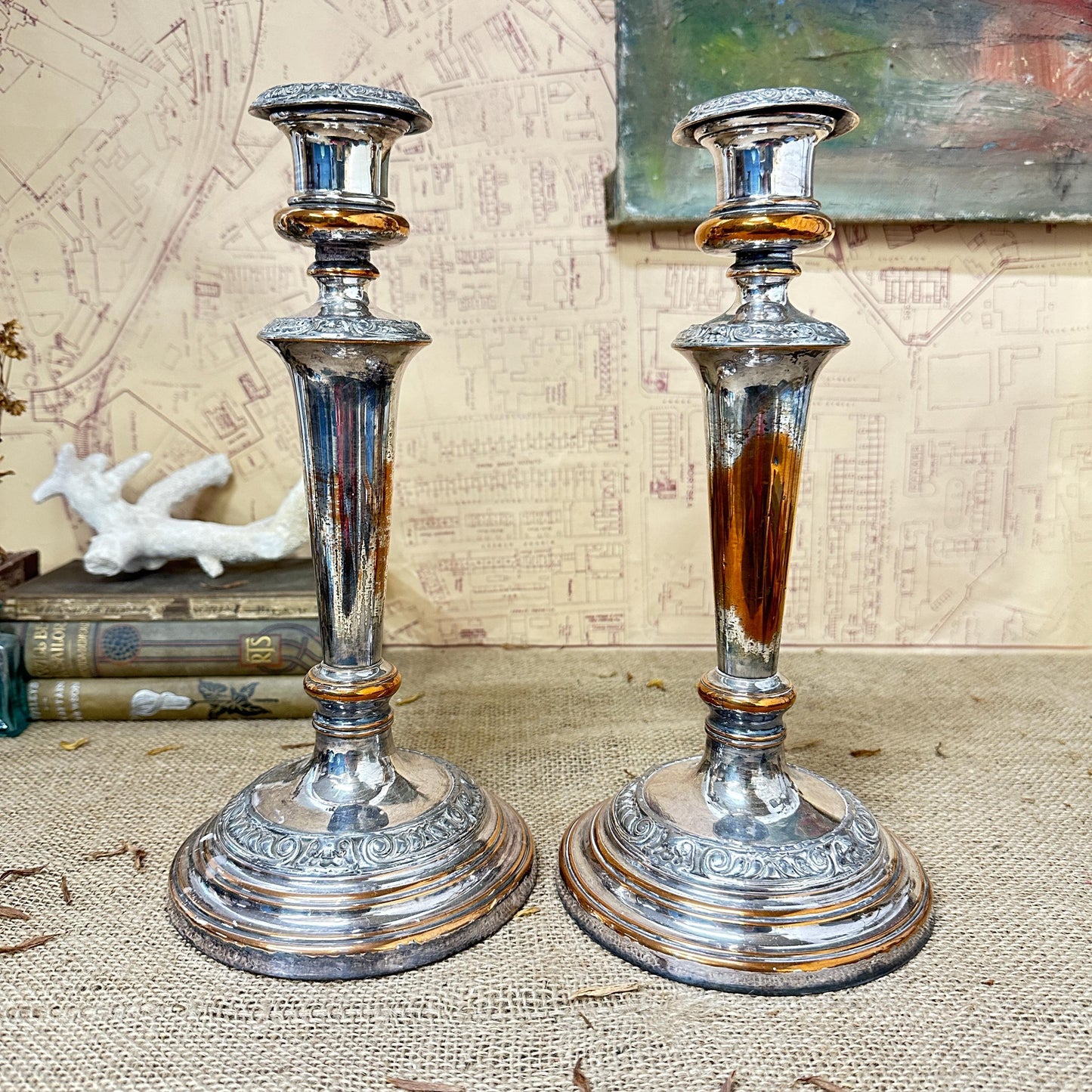 Pair of very handsome heavy silver plated candlesticks, very elegant. Much loved & polished over the years - the copper is showing on serval parts. This adds an almost spellbinding charm that looks like its come straight from Mrs Haversham's table in Great Expectations