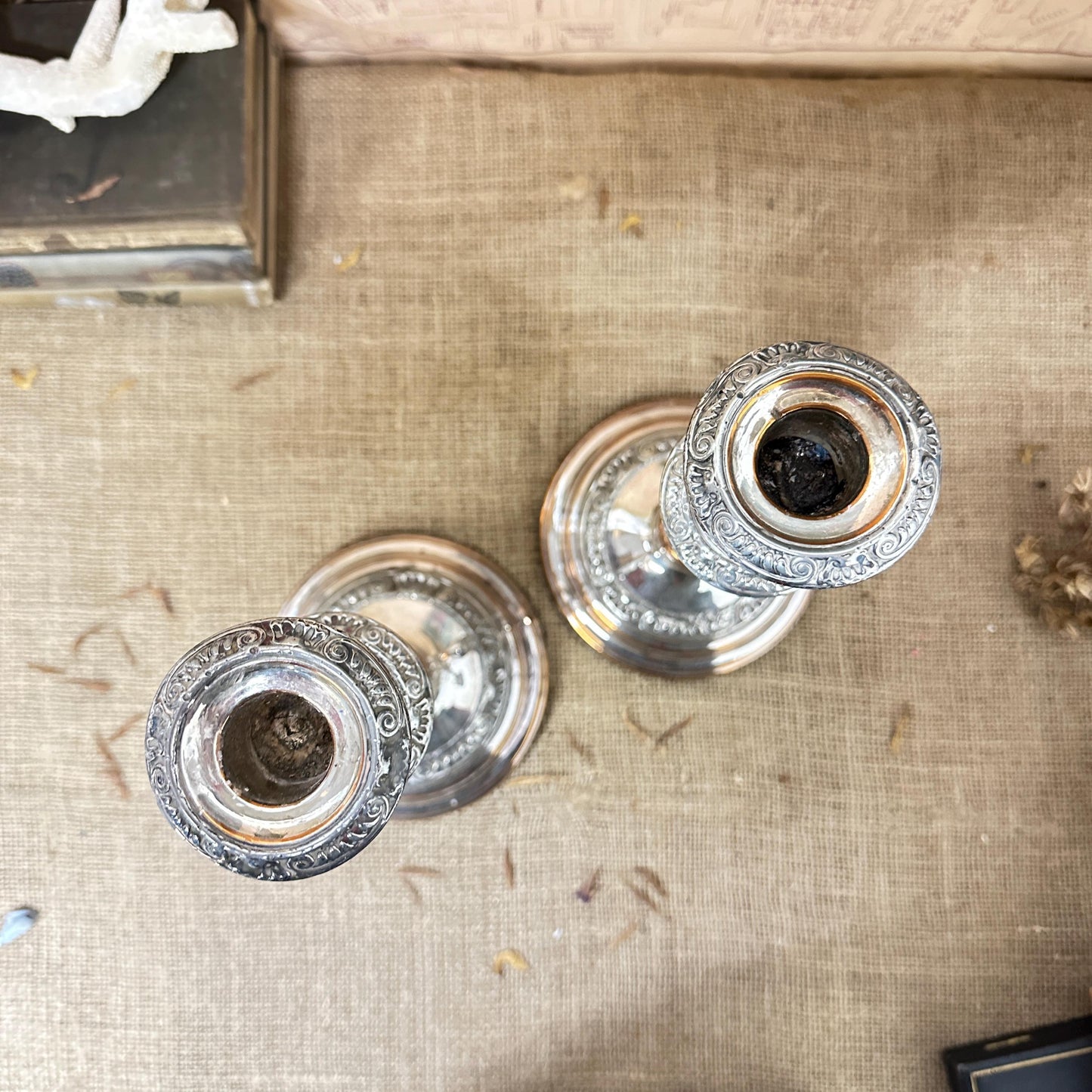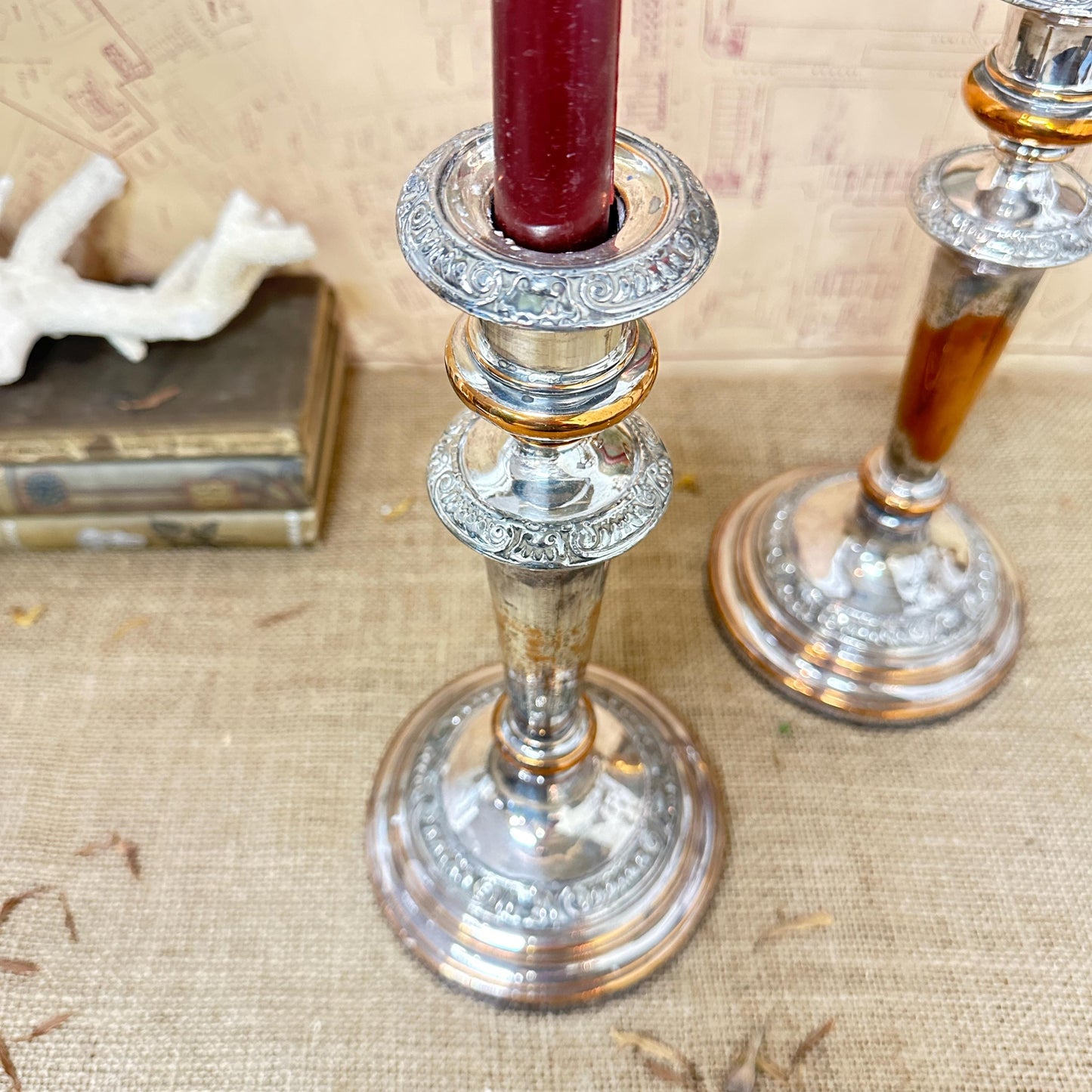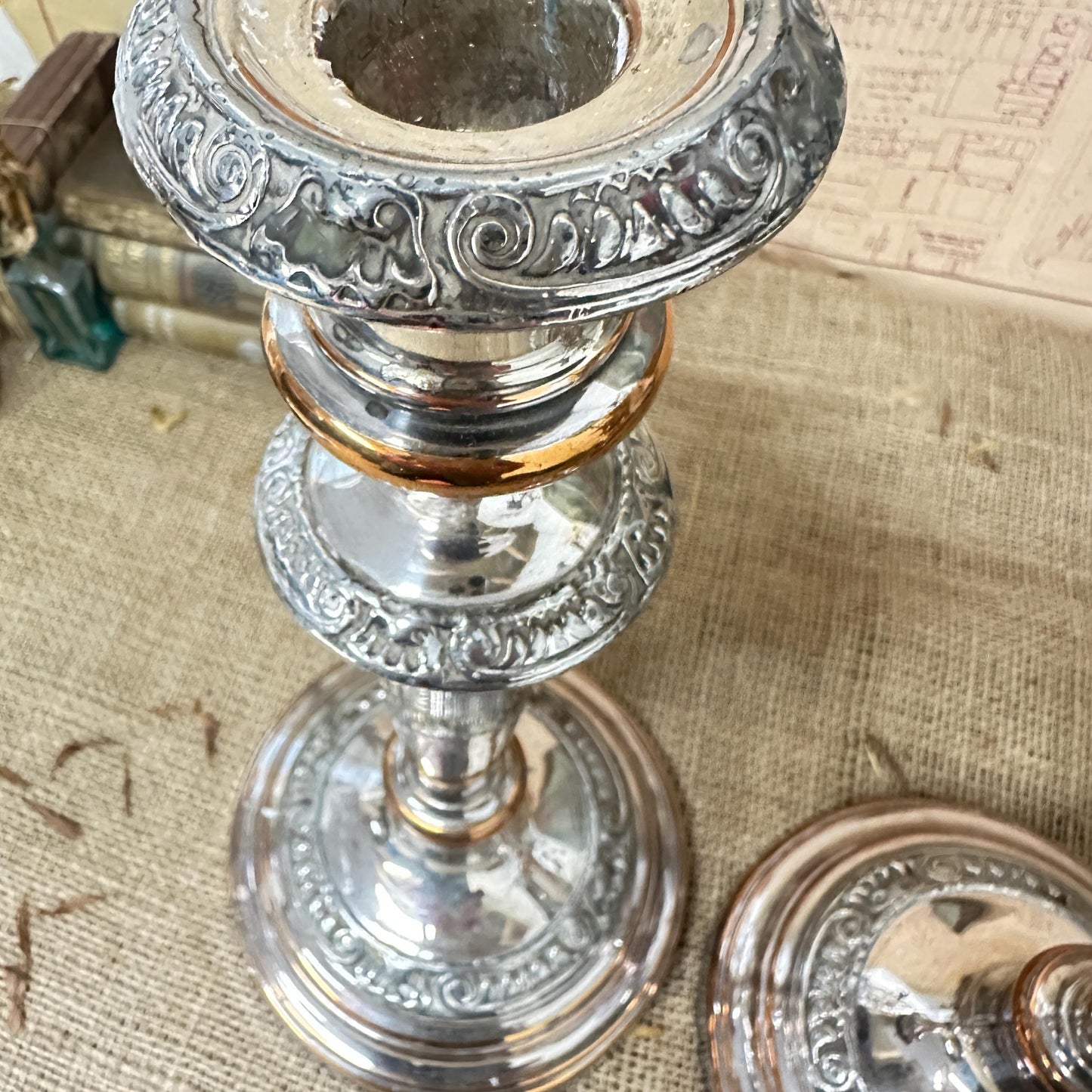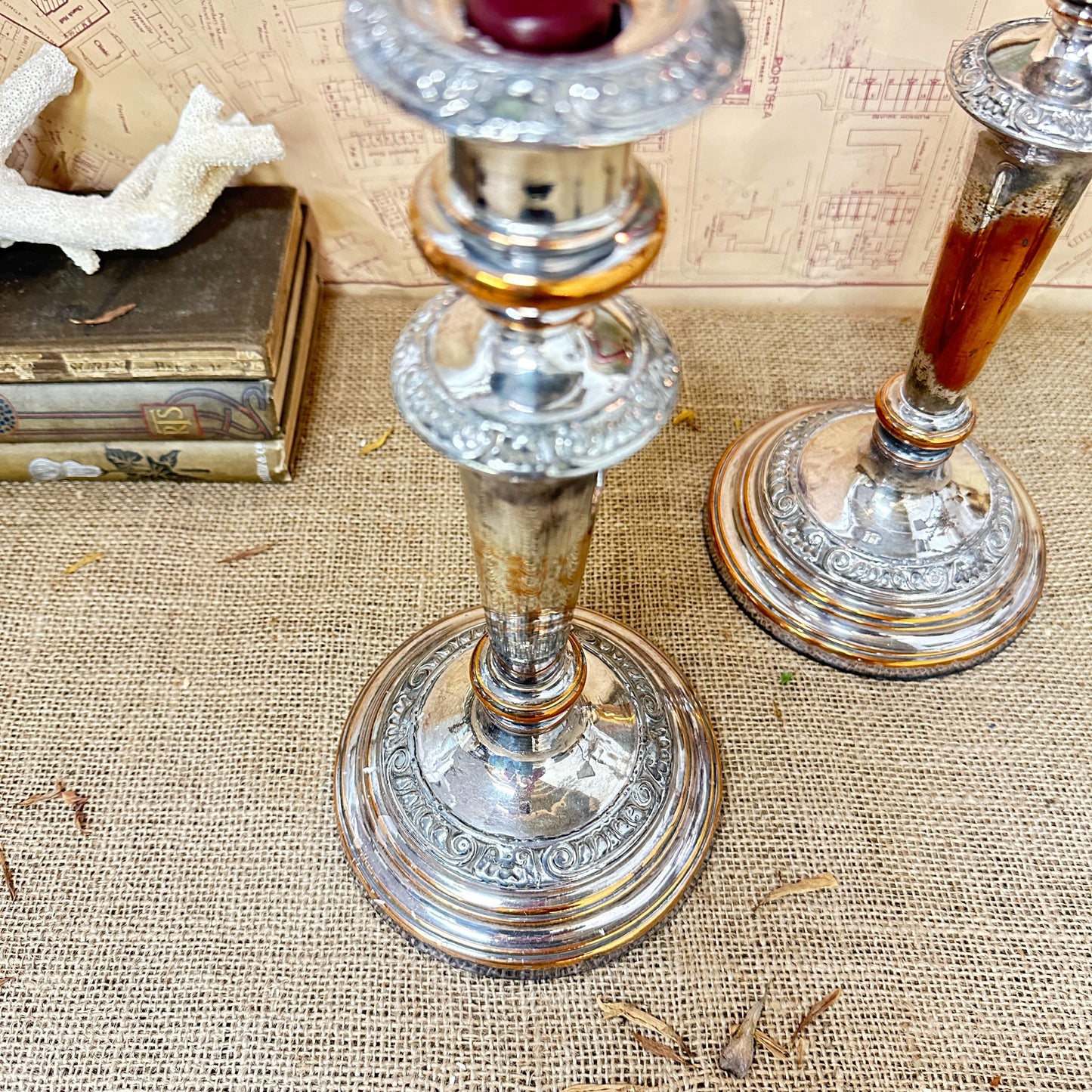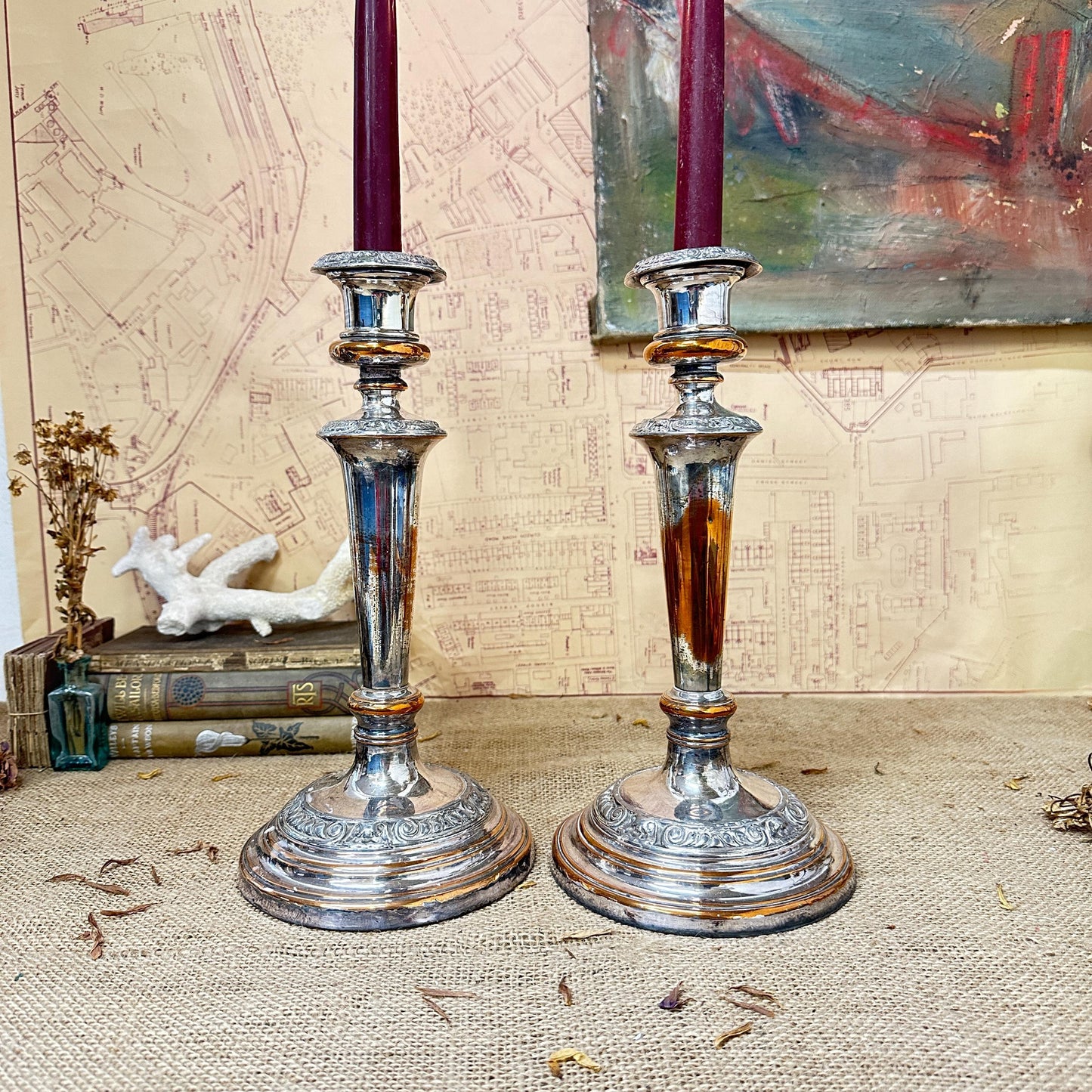Pair of very handsome heavy silver plated candlesticks, very elegant. Much loved & polished over the years - the copper is showing on serval parts. This adds an almost spellbinding charm that looks like its come straight from Mrs Haversham's table in Great Expectations