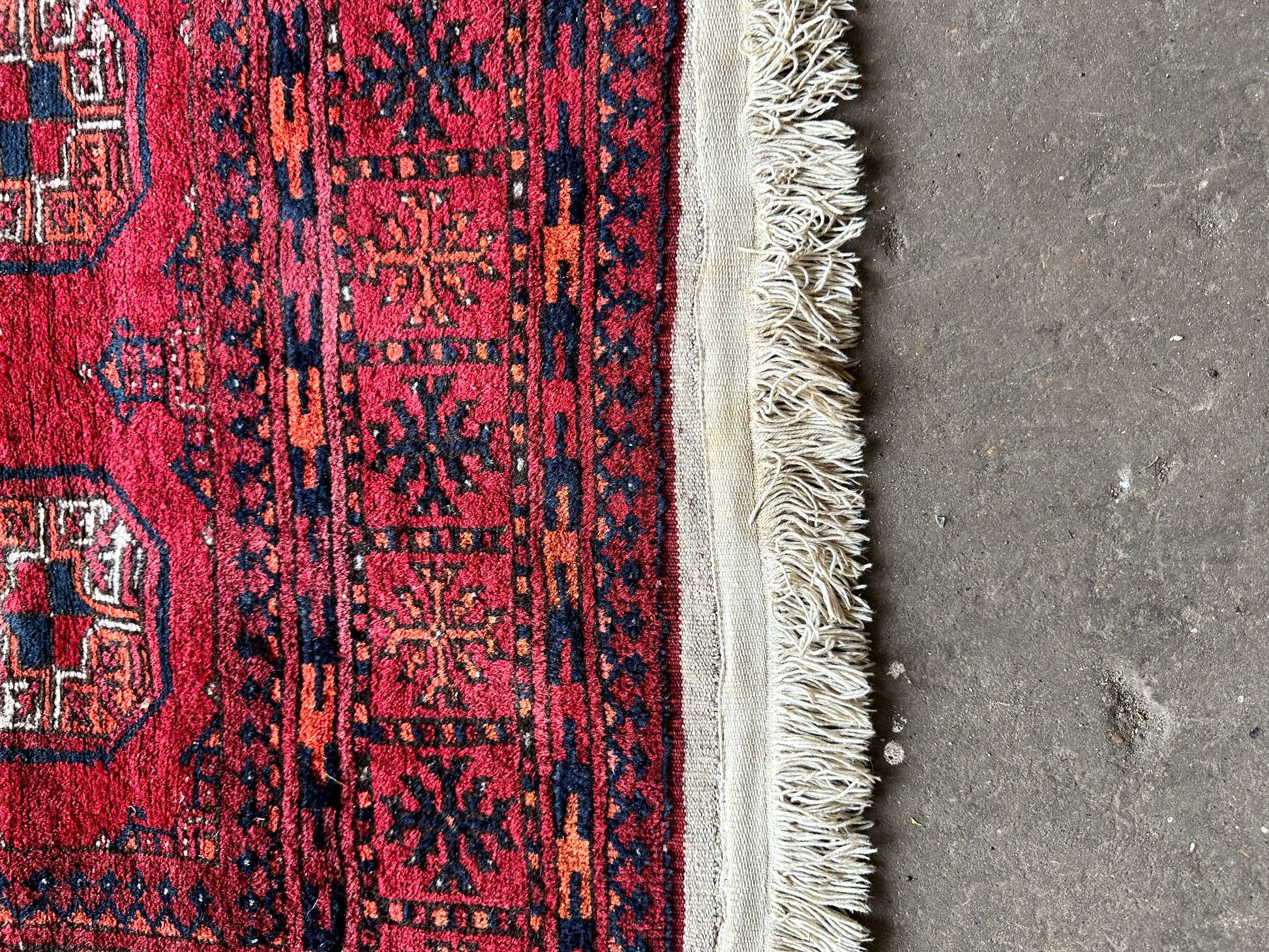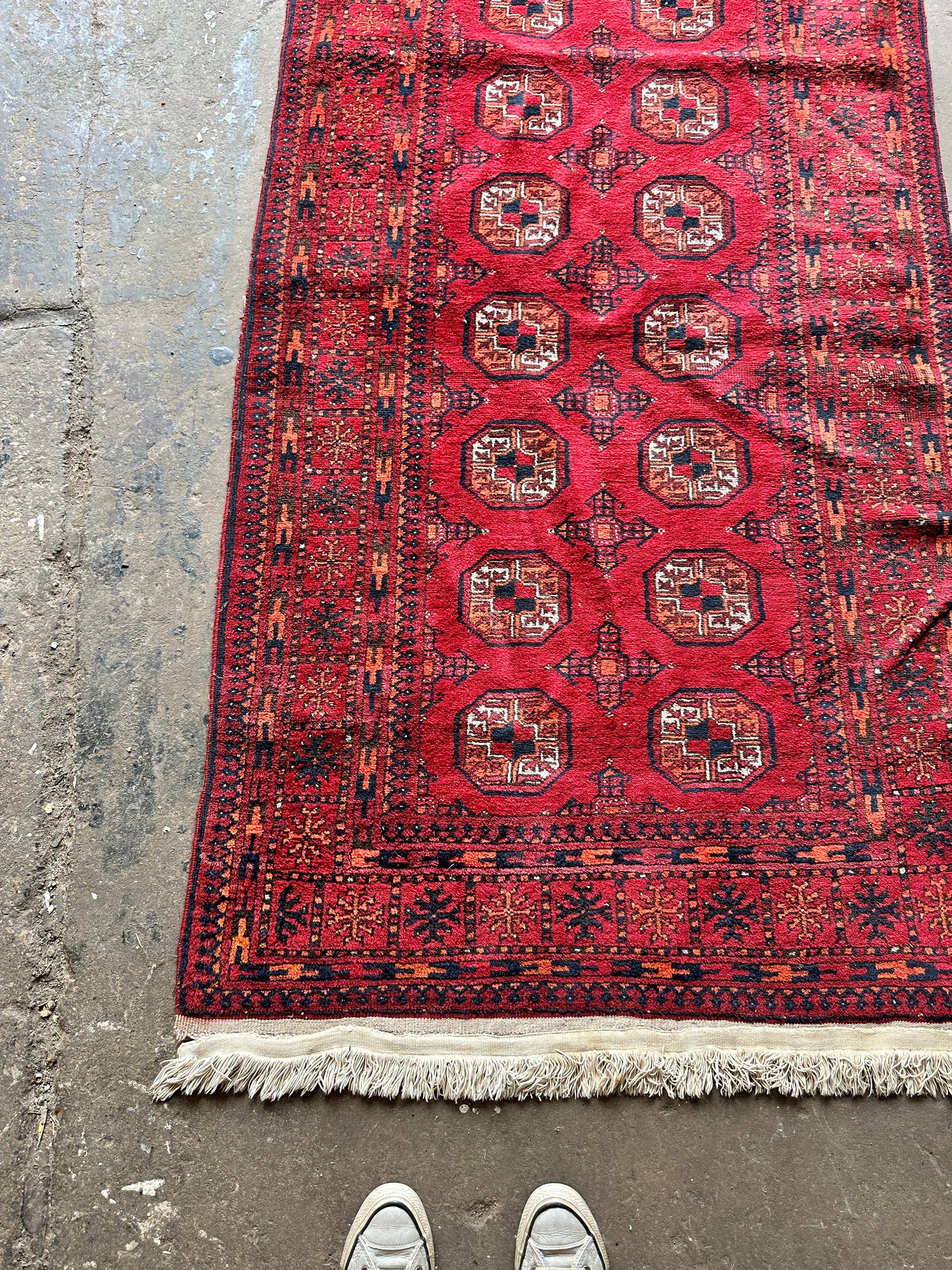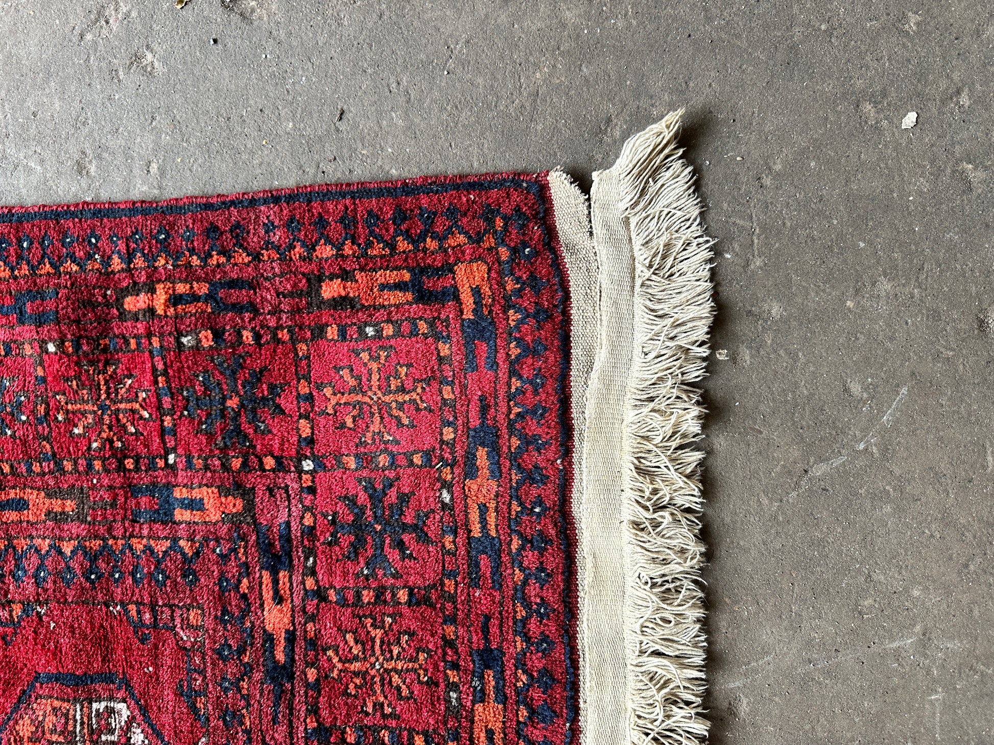 Antique wool Afghan Bokhara rug - no thinning or holes but will probably need a clean. Some damage to the trim please see pictures. Bring your home to life with a pop of red