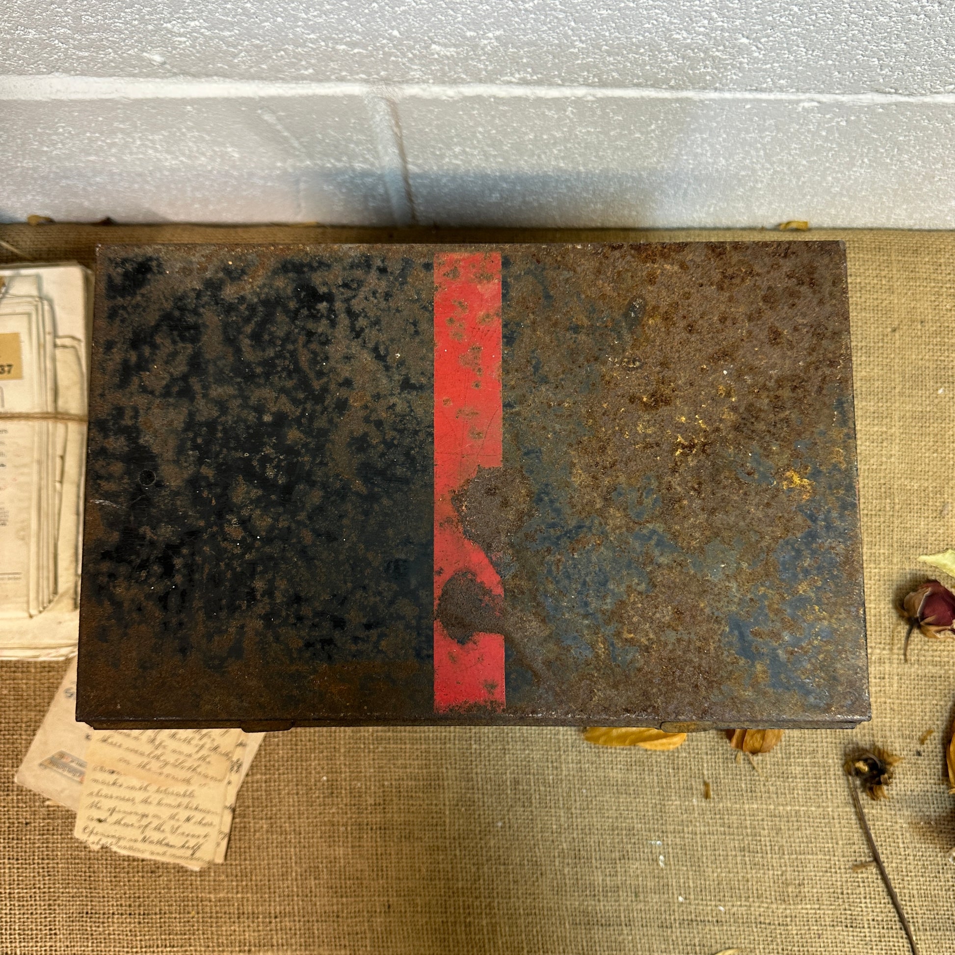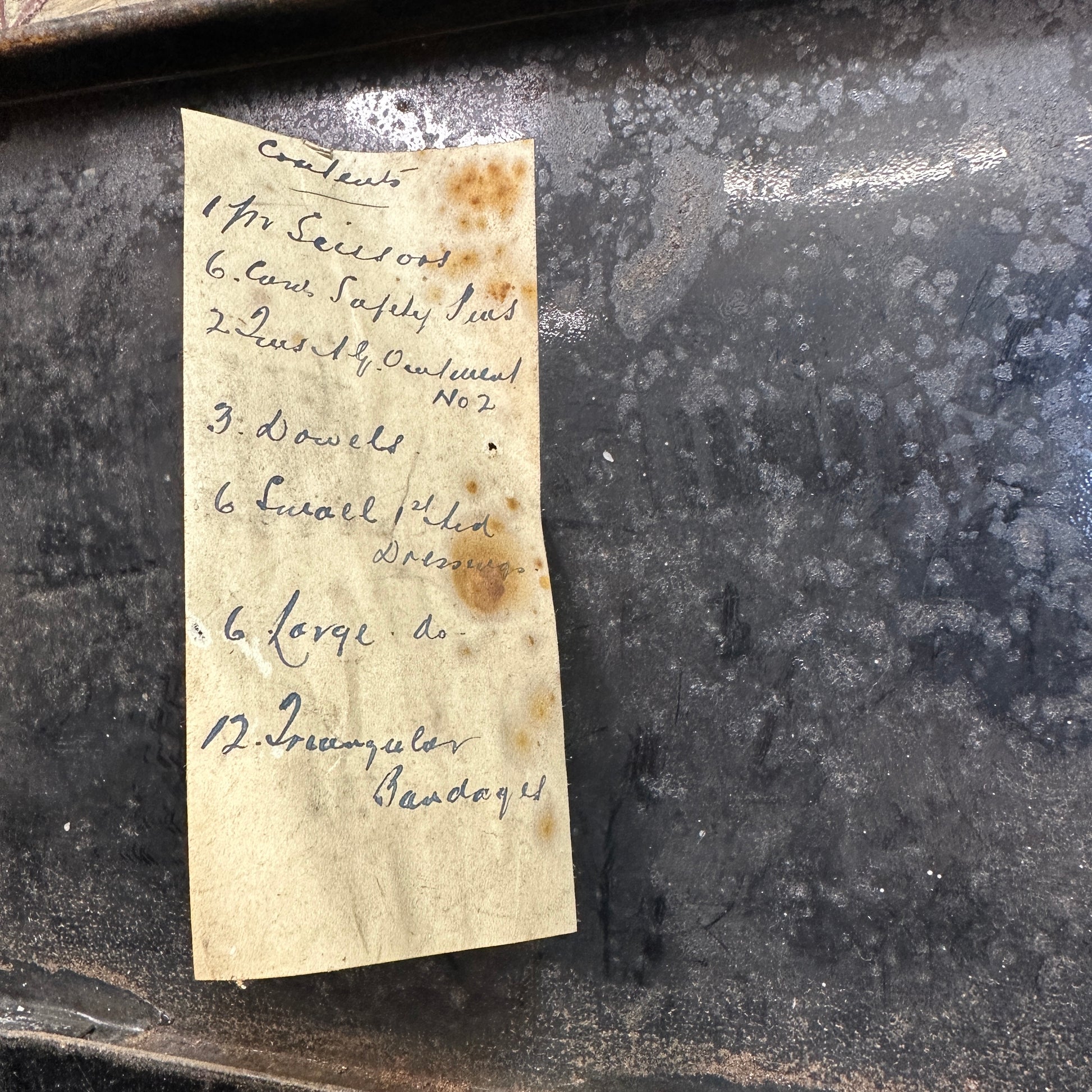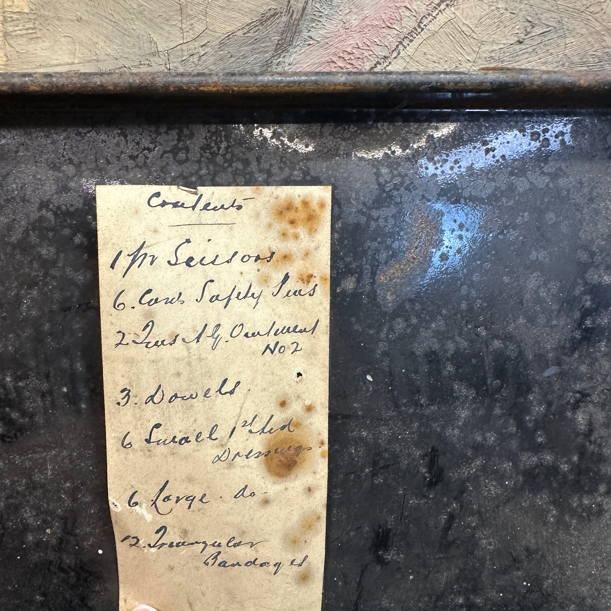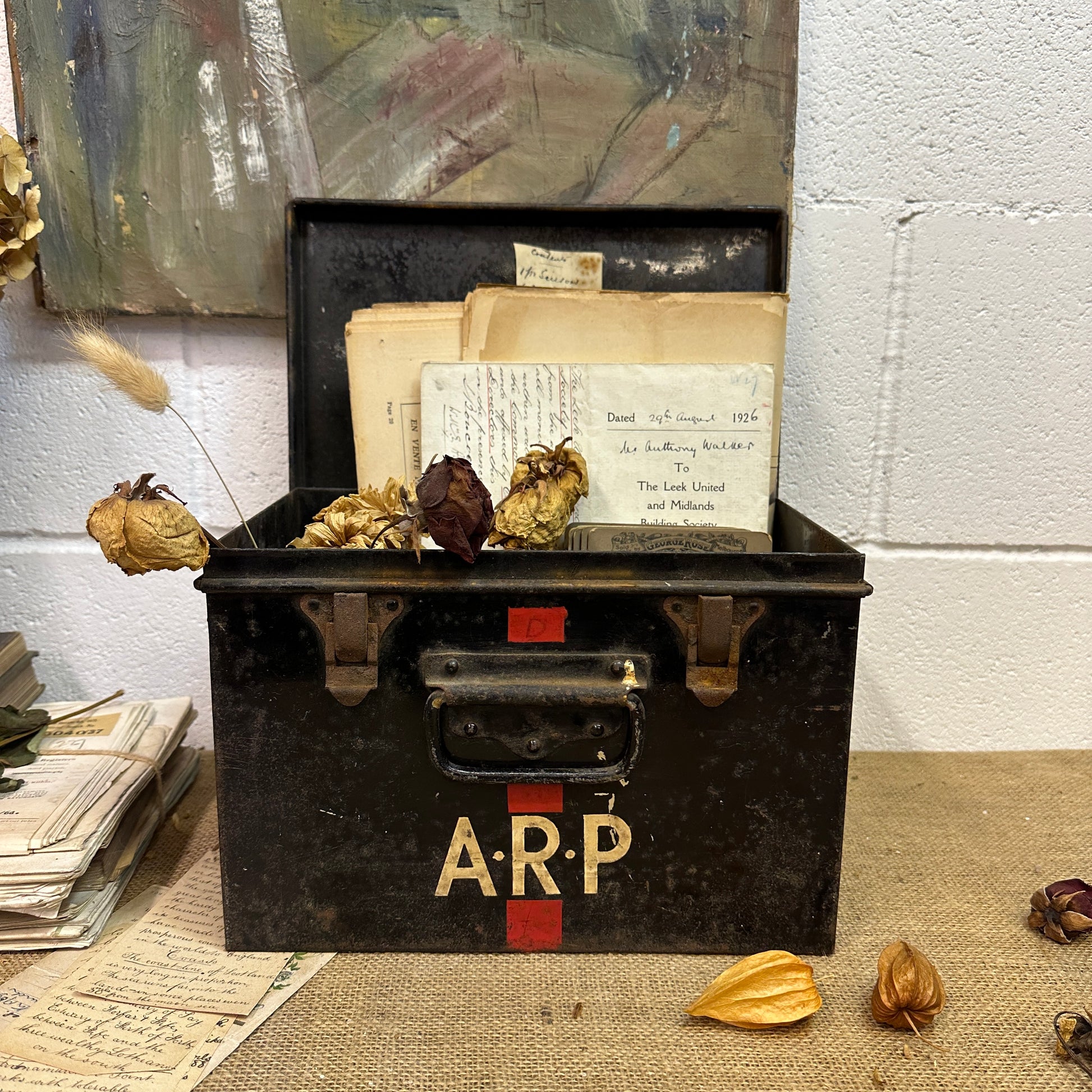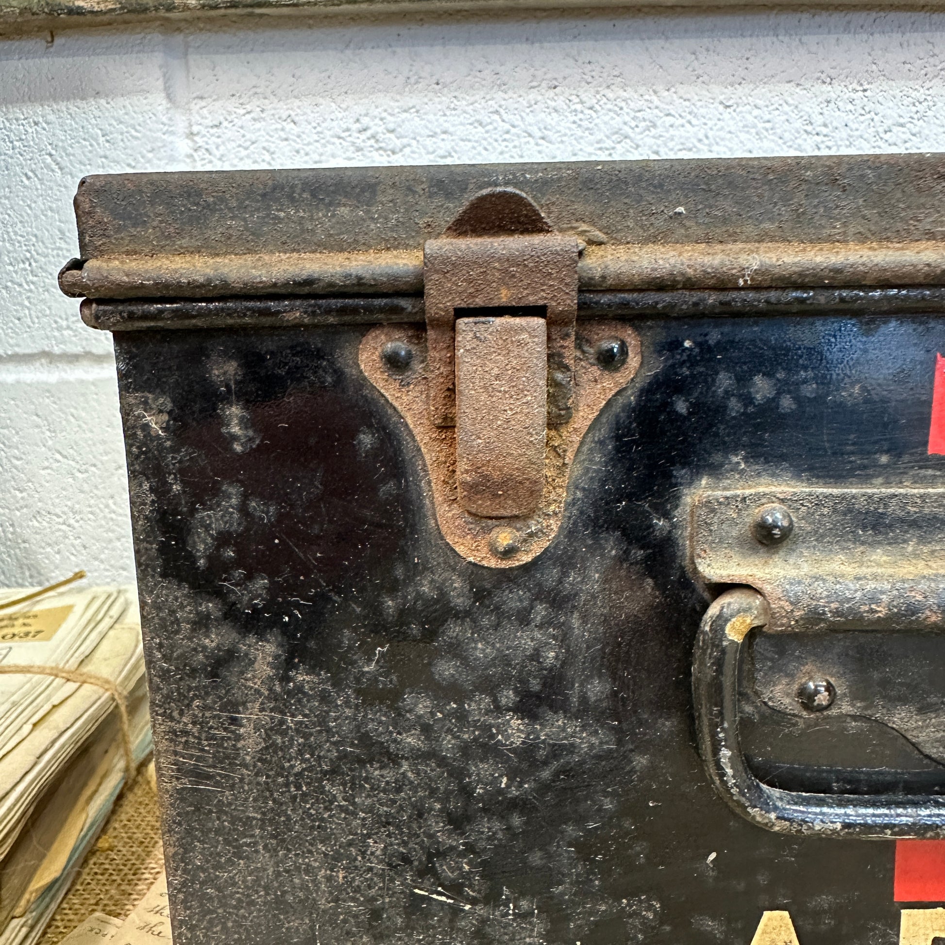 This is a fantastic black first aid tin with the letters A.R.P. This stands for Air Raid Precautions, a civilian defence organization during the war. These boxes were produced for use by ARP wardens to provide immediate medical assistance after air raids.