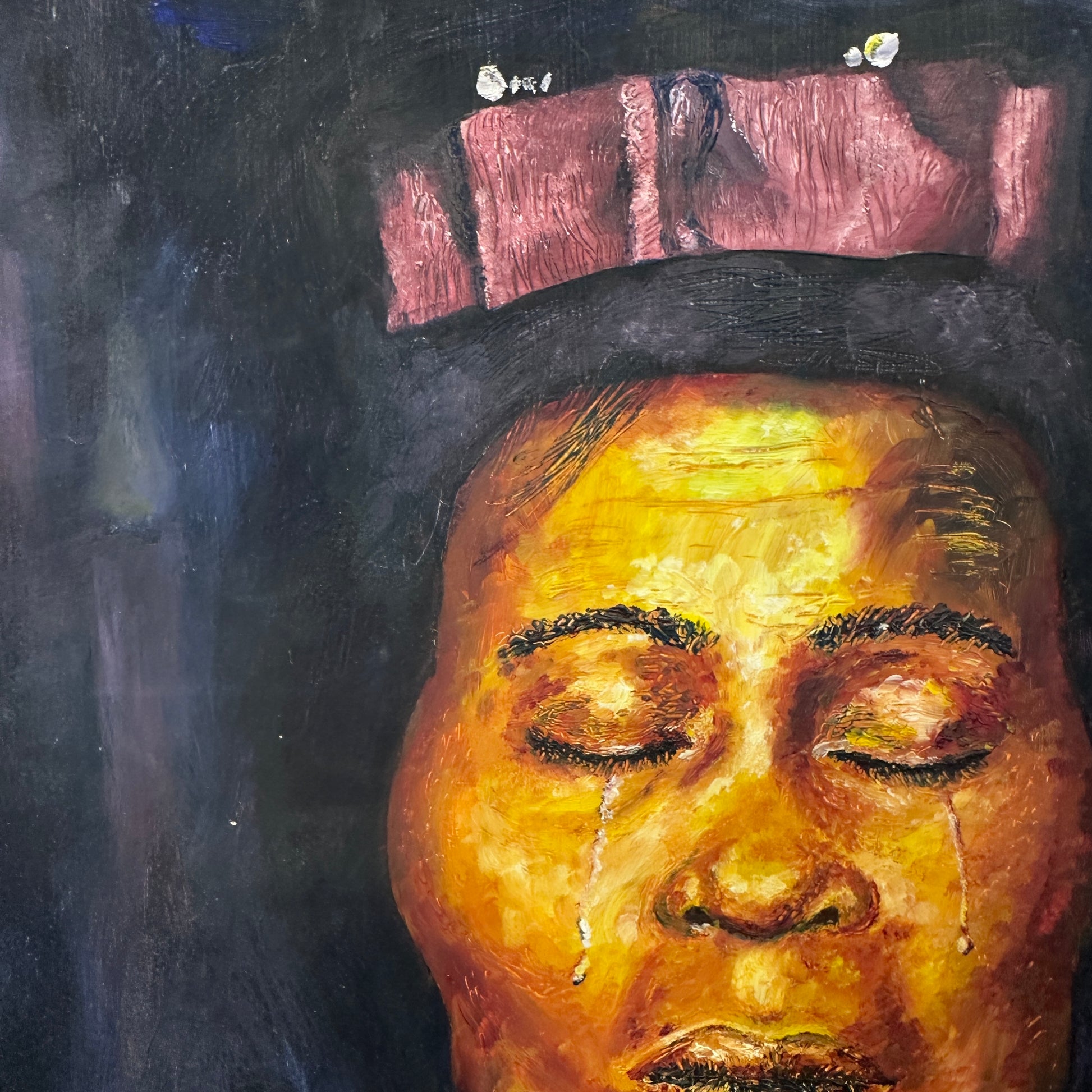 Bathed in warm, golden tones against a dark void, this portrait captures a moment of deep stillness. With eyes closed and tears trailing down the face. The figure evokes quiet strength and inner peace, crowned subtly in a symbol of dignity and resilience.
