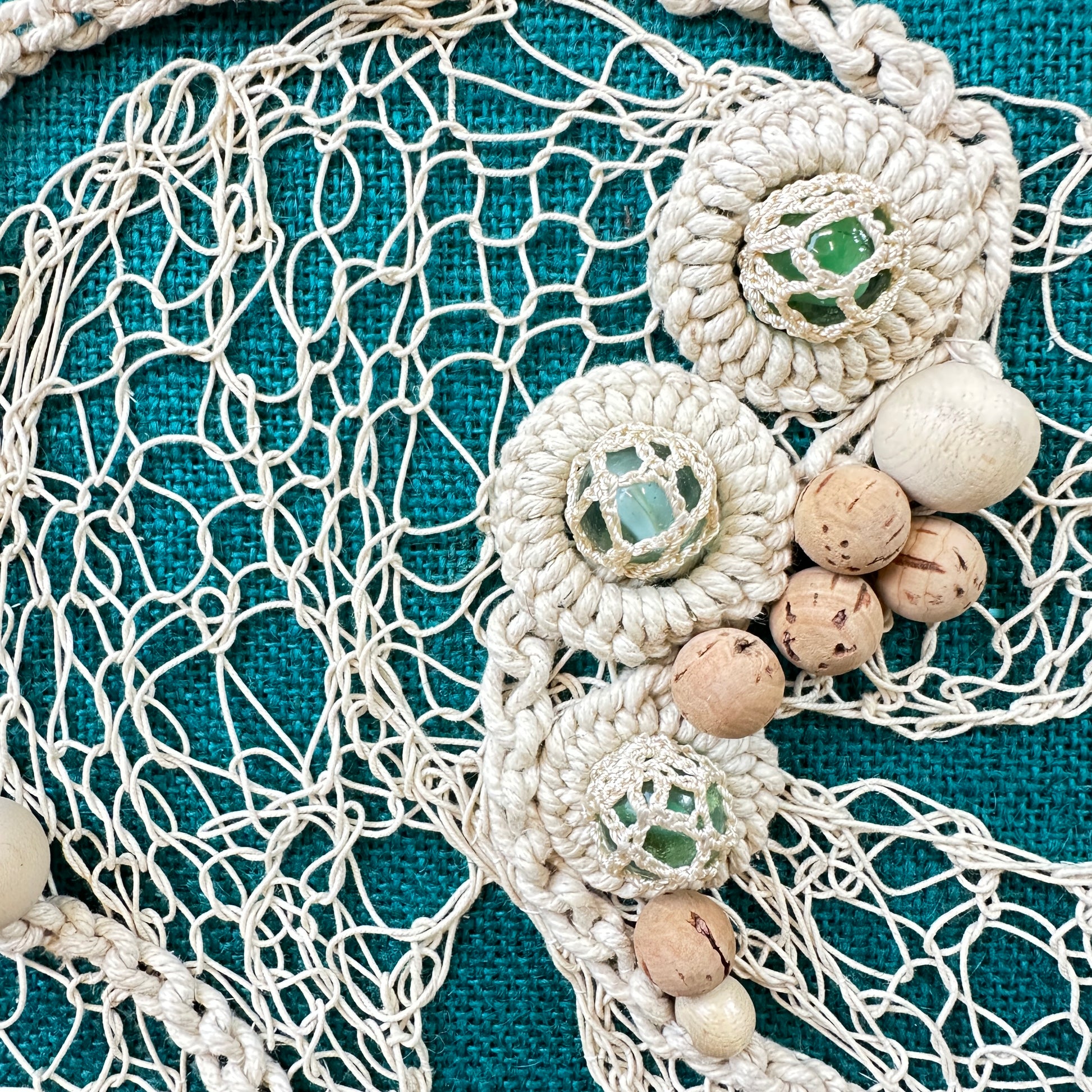 Stunning handmade Mid Century Textile Crochet Artwork on a teal board.