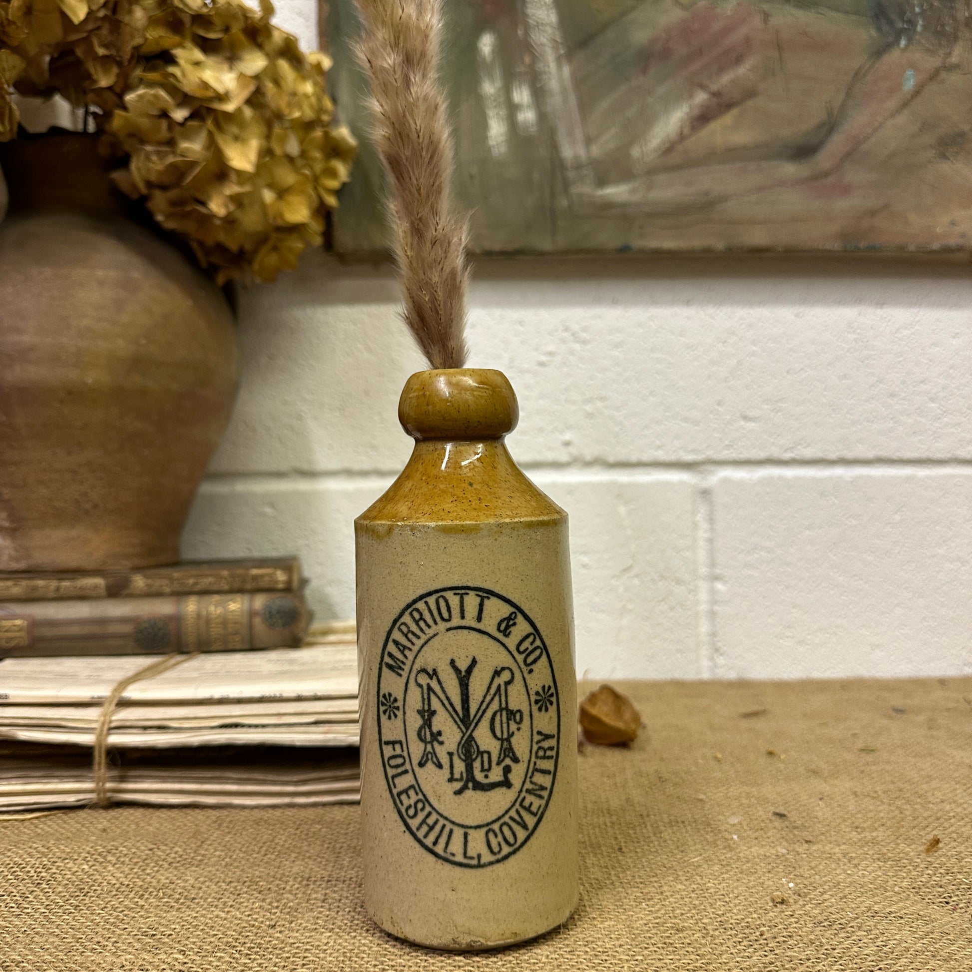Stoneware bottle by Marriott & Co. stoneware ginger beer bottle from Foleshill, Coventry, perfect table decor for holding candles or dried flowers