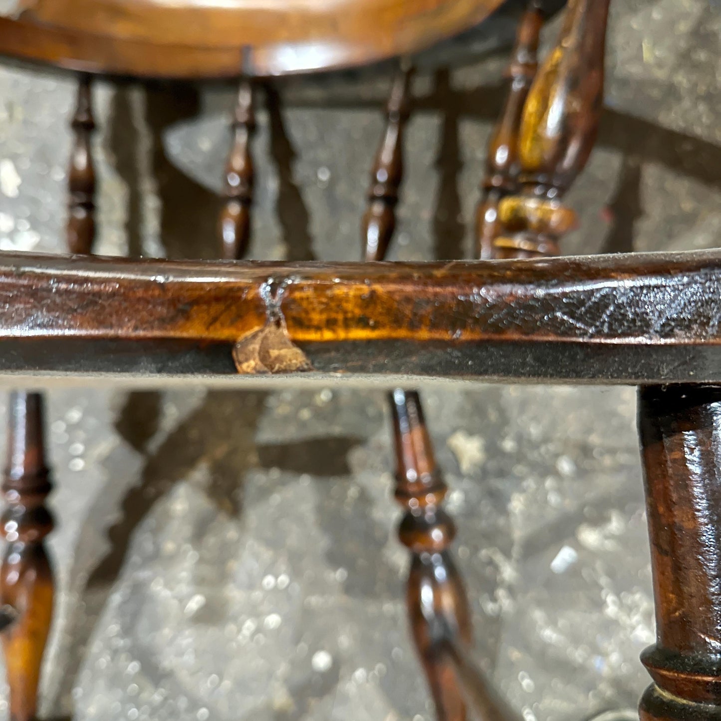 The wood used gives an almost two look to this item with spills out charm. H stretcher to the base with some wear. The seat has a small piece missing on the underside please see pictures