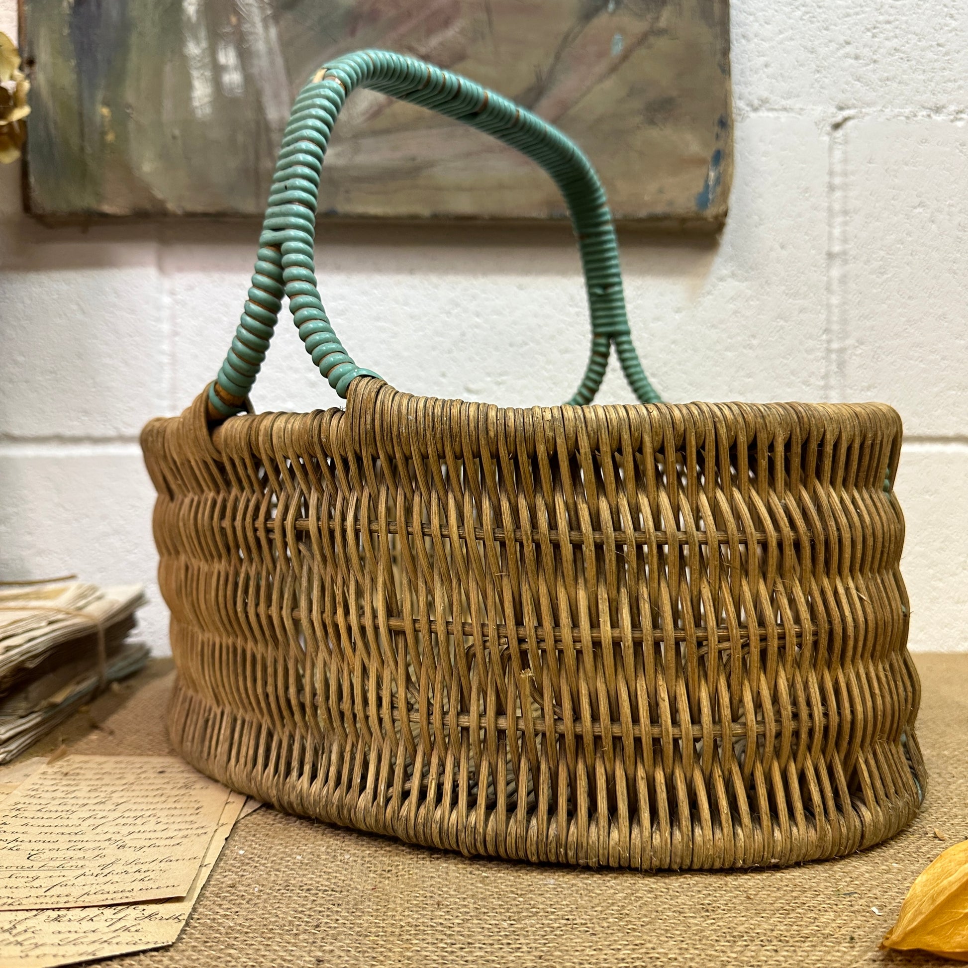 Vintage Wicker Hand Woven Basket Blue