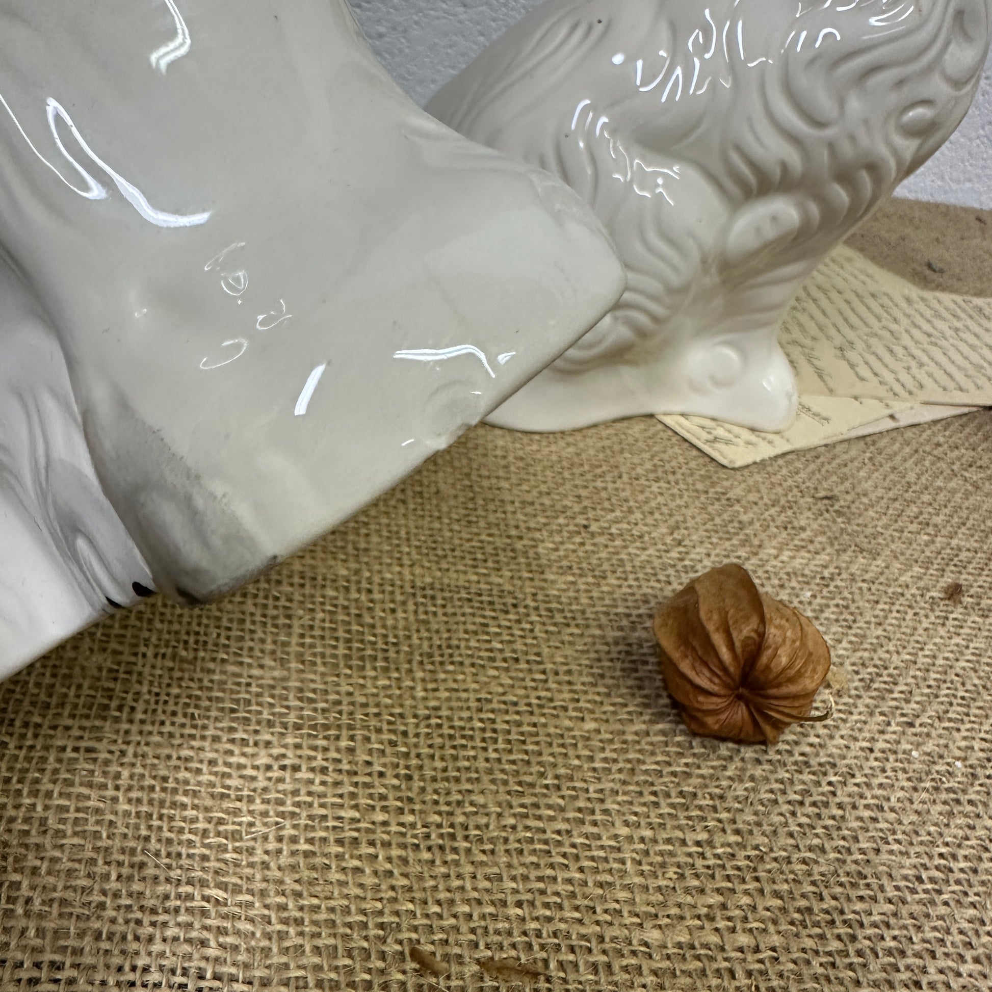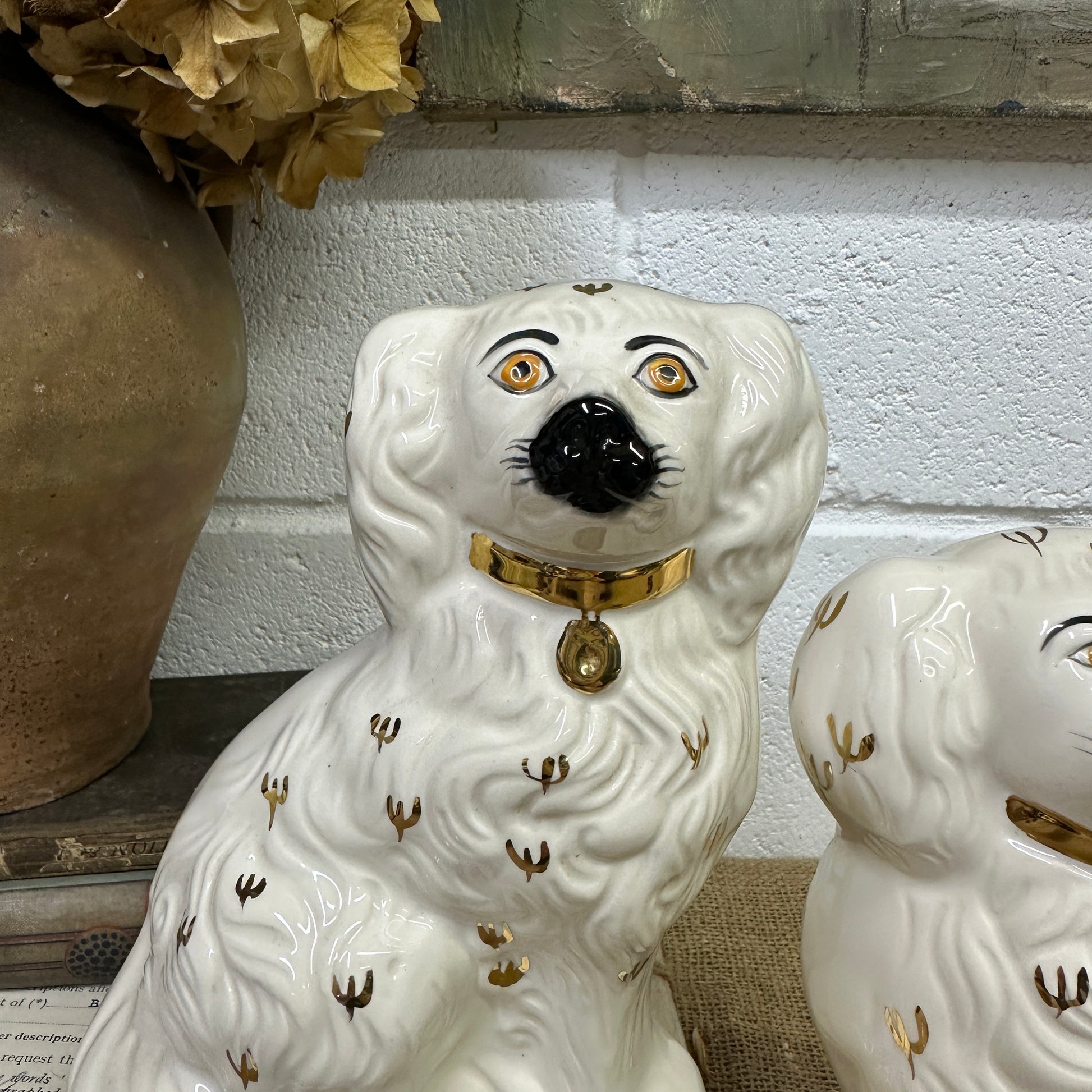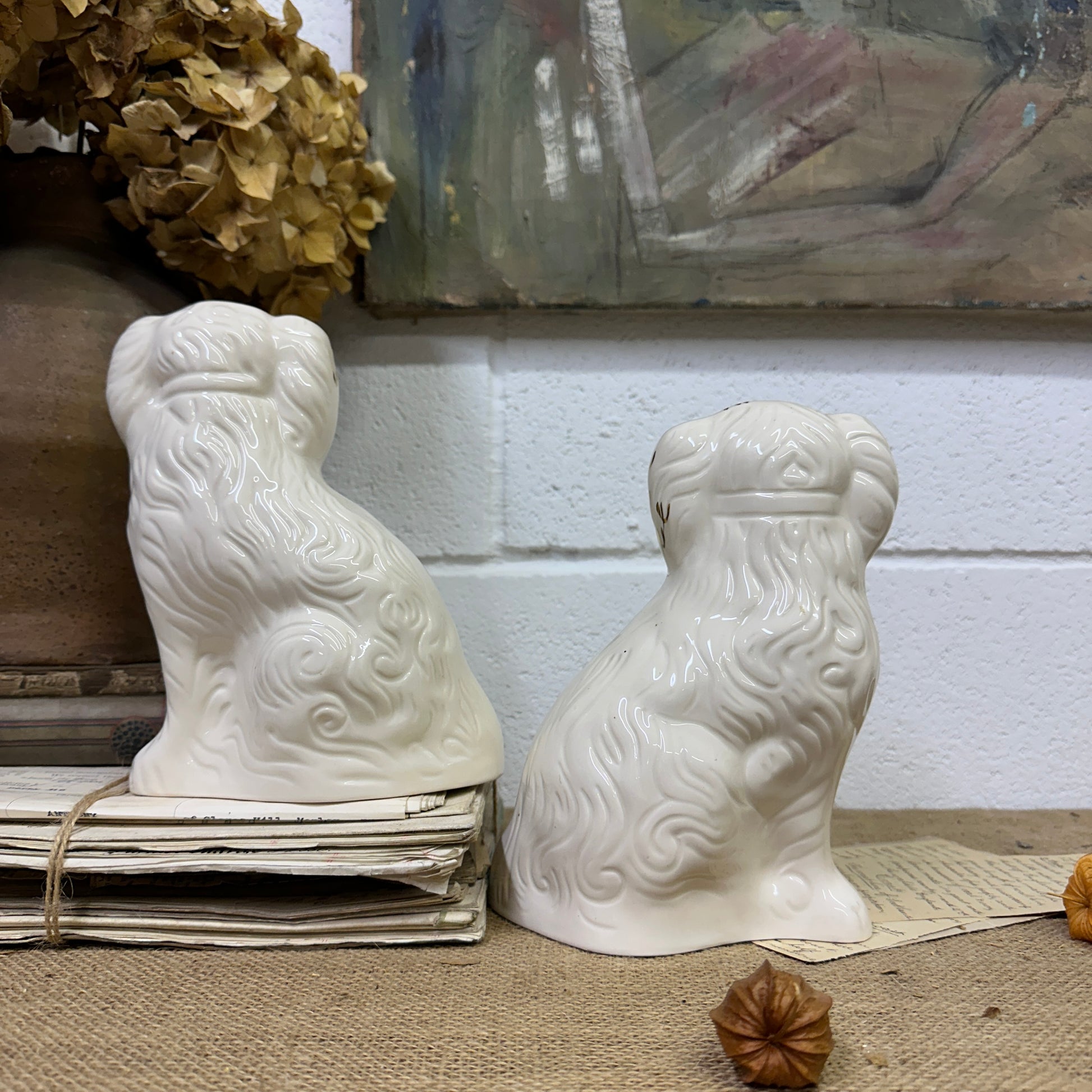 Handsome pair of King Charles pottery fireside Spaniels in white trimmed with gold. In great condition -one small chip to base please see photographs